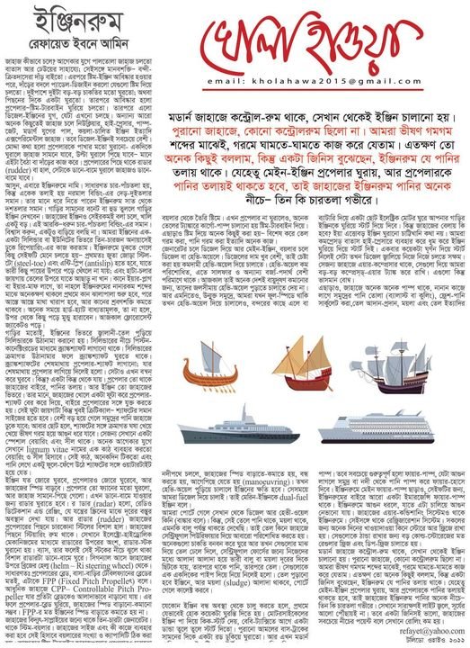 মডার্ন জাহাজে কন্ট্রোল-রুম থাকে, সেখান থেকেই ইঞ্জিন চালানো হয়। পুরানো জাহাজে, কোনো কন্ট্রোলরুম ছিলো না। আমরা ভীষণ গমগম শব্দের মাঝেই, গরমে ঘামতে ঘামতে কাজ করে যেতাম। এতক্ষণ তো অনেক কিছুই বললাম, কিন্তু একটা জিনিস বুঝেছেন, ইঞ্জীনরুম যে পানির তলায় থাকে। যেহেতু মেইন-ইঞ্জিন প্রপেলার ঘুরায়, আর প্রপেলারকে পানির তলায়ই থাকতে হবে, তাই জাহাজের ইঞ্জিনরুম পানির অনেক নীচে – তিন কি চারতলা গভীরে।