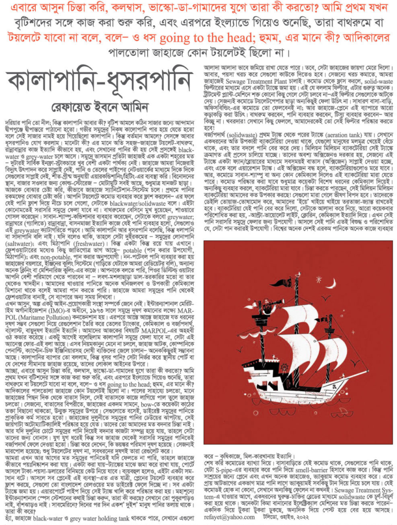 আচ্ছা, এবারে আসুন চিন্তা করি, কলম্বাস, ভাস্কো-ডা-গামাদের যুগে তারা কী করতো? আমি প্রথম যখন বৃটিশদের সঙ্গে কাজ করা শুরু করি, এবং এরপরে ইংল্যান্ডে গিয়েও শুনেছি, তারা বাথরুমে বা টয়লেটে যাবো না বলে, বলে – I am going to the head; হুমম, এর মানে কী? আদিকালের পালতোলা জাহাজে কোন টয়লেটই ছিলো না। পালের সাহায্যে চলতো, মানে জাহাজের পিছনদিক থেকে বাতাস দিলে, সেই বাতাসকে কাজে লাগিয়ে পাল তুলে জাহাজ চলতো। সেজন্যে, বাতাসের বিপরীতে, জাহাজের একদম সামনে, bow-তে কয়েকটা কাঠের তক্তা বিছানো থাকতো, উন্মুক্ত সমুদ্রের উপরে। সেগুলোতে বসেই, ডাইরেক্ট সমুদ্রের পানিতে প্রাকৃতিক কর্ম সারতে হতো। জাহাজের দুলুনীতে সমুদ্রের পানির ঢেউয়ের ঝাপটায়, সেই জায়গাটা অটোম্যাটিক্যালিই পরিষ্কার হয়ে যেত। তাদের তো আমাদের মত বদনার চিন্তা নাই। আর যদি দুলুনীর চোটে সমুদ্রের পানি দিয়েই বদনার কাজটা সম্পন্ন হয়ে যায়, তাহলে সেটা তাদের জন্য বোনাস। যুগ যুগ ধরেই কিন্তু সব জাহাজ থেকেই সরাসরি সমুদ্রের পানিতেই বর্জ্যপদার্থ ফেলে দেওয়া হতো। চিন্তা করে দেখেন, কি ভয়ঙ্কর পরিমাণ দূষণ হয়েছে। সেজন্যই মারপোল হয়েছে; শুধু টয়লেটের দূষণ না, সবধরনের দূষণই তারা রেগুলেট করে।