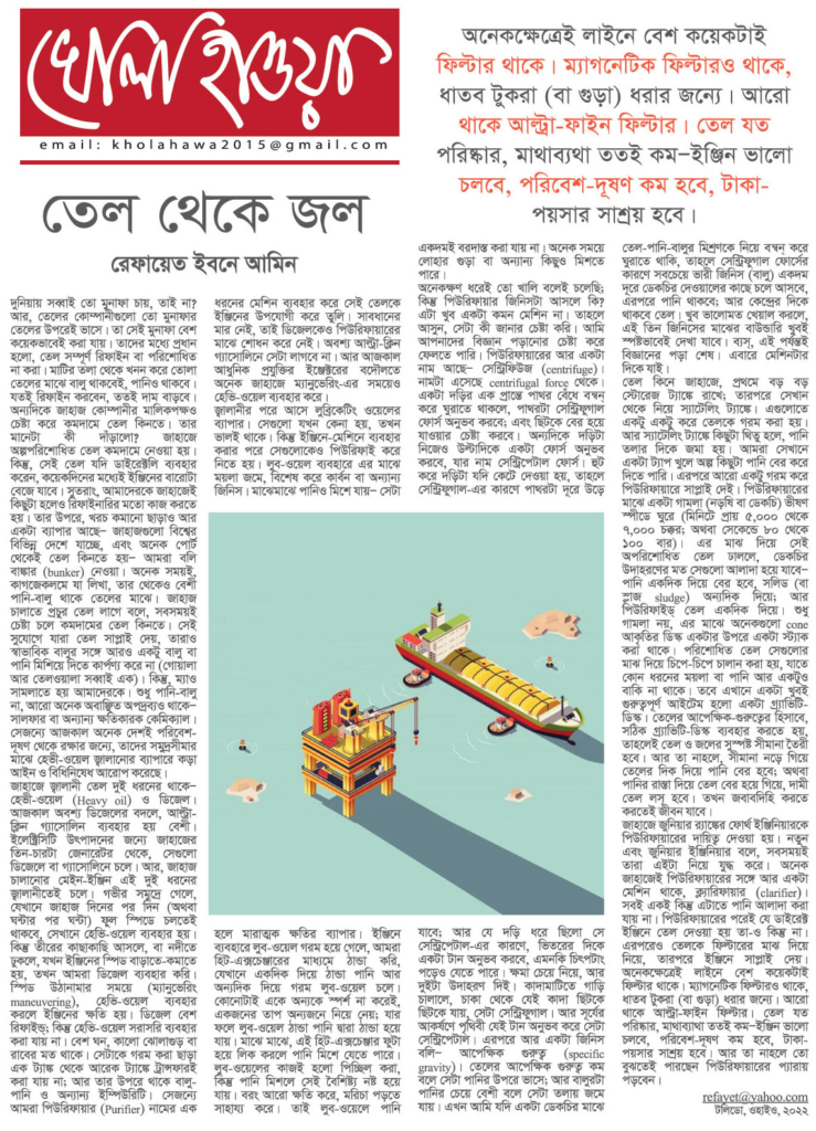 দুনিয়ায় সব্বাই তো মুনাফা চায়, তাই না? আর, তেলের কোম্পানীগুলো তো মুনাফার তেলের উপরেই ভাসে। তা সেই মুনাফা বেশ কয়েকভাবেই করা যায়। তাদের মধ্যে প্রধান হলো, তেল সম্পূর্ণ রিফাইন বা পরিশোধিত না করা। মাটির তলা থেকে খনন করে তোলা তেলের মাঝে বালু থাকবেই, পানিও থাকবে। যতই রিফাইন করবেন, ততই দাম বাড়বে। অন্যদিকে জাহাজ কোম্পানীর মালিকপক্ষও চেষ্টা করে কমদামে তেল কিনতে। তার মানেটা কী দাড়ালো? জাহাজে অল্পপরিশোধিত তেল কমদামে নেওয়া হয়। কিন্তু, সেই তেল যদি ডাইরেক্টলি ব্যবহার করেন, কয়েকদিনের মধ্যেই ইঞ্জিনের বারোটা বেজে যাবে। সুতরাং, আমাদেরকে জাহাজেই কিছুটা হলেও রিফাইনারির মতো কাজ করতে হয়। তার উপরে, খরচ কমানো ছাড়াও আর একটা ব্যাপার আছে – জাহাজগুলো বিশ্বের বিভিন্ন দেশে যাচ্ছে, এবং অনেক পোর্ট থেকেই তেল কিনতে হয় – আমরা বলি বাঙ্কার (bunker) নেওয়া। অনেক সময়ই, কাগজেকলমে যা লিখা, তার থেকেও বেশী পানি-বালু থাকে তেলের মাঝে। জাহাজ চালাতে প্রচুর তেল লাগে বলে, সবসময়ই চেষ্টা চলে কমদামের তেল কিনতে। সেই সুযোগে যারা তেল সাপ্লাই দেয়, তারাও স্বাভাবিক বালুর সঙ্গে আরো একটু বালু বা পানি মিশিয়ে দিতে কার্পণ্য করে না (গোয়ালা আর তেলওয়ালা সব্বাই এক)। কিন্তু, ম্যাও সামলাতে হয় আমাদেরকে। শুধু পানি-বালু না, আরো অনেক অবাঞ্ছিত অপদ্রব্যও থাকে – সালফার বা অন্যান্য ক্ষতিকারক কেমিক্যাল। সেজন্যে আজকাল অনেক দেশই পরিবেশ-দূষণ থেকে রক্ষার জন্যে, তাদের সমুদ্রসীমার মাঝে হেভী-ওয়েল জ্বালানোর ব্যাপারে কড়া আইন ও বিধিনিষেধ আরোপ করেছে।