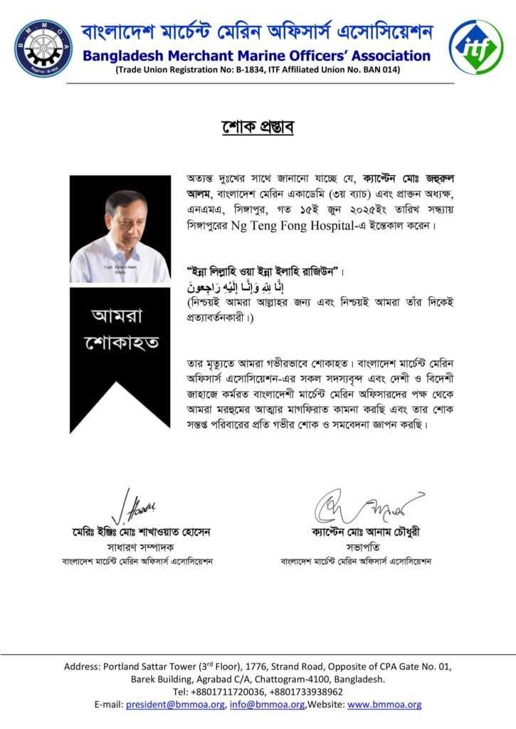 It is with profound sorrow that we announce the passing of Captain Md. Zahurul Alam, a respected mariner, mentor, and former Principal of the NMA, Singapore. Captain Alam passed away on the evening of 15 June 2025 at Ng Teng Fong Hospital, Singapore.