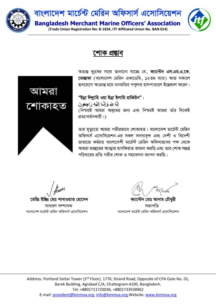 বাংলাদেশ মার্চেন্ট মেরিন অফিসার্স এসোসিয়েশন মরহুমের মৃত্যুতে গভীর শোক প্রকাশ করছে। মরহুমের আত্মার মাগফিরাত কামনা করা হচ্ছে এবং শোকসন্তপ্ত পরিবারের প্রতি আন্তরিক সমবেদনা জ্ঞাপন করা হলো। এ শোকবার্তা জানানো হলো বাংলাদেশ মার্চেন্ট মেরিন অফিসার্স এসোসিয়েশন-এর সকল সদস্যবৃন্দ এবং দেশী ও বিদেশী জাহাজে কর্মরত বাংলাদেশী মার্চেন্ট মেরিন অফিসারদের পক্ষ থেকে।