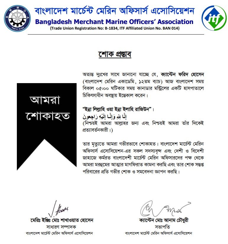 The entire community of Bangladeshi mariners—both at home and abroad—express their heartfelt condolences to the bereaved family.