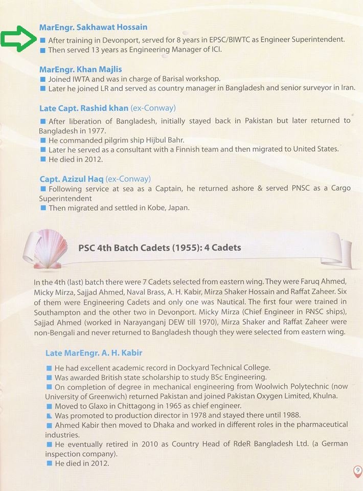 Chief Engineer Sakhawat Hussain was among the first group of Bangladeshi Mariners recruited by the then Pakistan Public Service Commission’s 3rd Batch (5 Cadets) in 1954. His remarkable journey and lifelong contributions to the maritime profession remain an inspiration to generations of Mariners. (Ref: Pioneer Mariners’ Brochure 2017, page 8a).